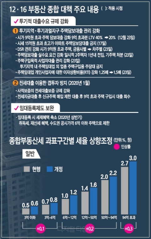 정부가 종합부동산세 인상 카드를 다시 꺼내 들었습니다. 지난해 9·13 대책에 비해 세율 인상 폭은 작지만 공시가격 시가 반영률 상향을 동반해 세 부담은 지난해에 못지않게 늘어날 것으로 전망됩니다. 조정대상지역 2주택자에 대한 세 부담 증가율 상한 확대도 재추진됩니다. 실수요자의 종부세 부담 완화를 위해 1가구 1주택 고령자와 장기 보유자에 대한 공제제도는 확대됩니다.