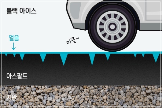 '블랙 아이스(Black Ice)' 현상은 현재와 같은 겨울철에 기온이 갑작스럽게 내려갈 경우, 도로 위에 내린 비나 녹았던 눈이 다시 얇은 빙판으로 얼어붙는 현상으로 낮 동안 내린 눈이나 비가 아스팔트 도로의 틈새에 스며들었다가 밤사이 도로의 기름·먼지 등과 섞여 도로 위에 얇게 얼어붙습니다. 이때 만들어진 얼음은 워낙 얇고 투명해서 도로의 검은 아스팔트 색이 그대로 비춰 보이기 때문에, 검은색 얼음이란 뜻의 '블랙 아이스'란 이름이 붙여졌습니다.