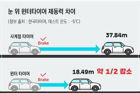 세 번째, 겨울철에 윈터 타이어를 장착하는 것이 좋습니다. 노면 결빙 상태에서는 마른 노면에 비해 제동 거리가 2배 이상 길어지므로 타이어 마모 상태를 점검하고 주기적으로 차량 점검을 받아 차량 적정 공기압을 유지하는 등의 노력이 필요하다. 브레이크를 밟을 때 한 번의 힘을 줘서 밟게 되면 제동이 잘 안 되고 스핀(회전) 현상이 발생될 수가 있습니다. 브레이크 조작은 두 번, 세 번에 나눠서 밟는 것이 중요합니다.