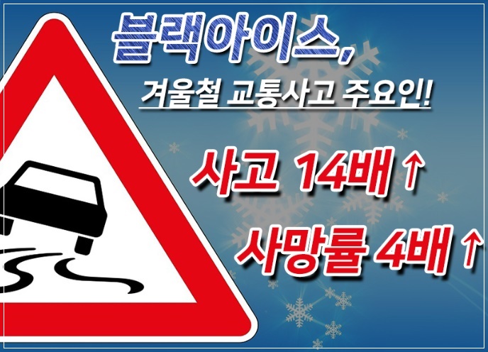 블랙아이스 때문에 많은 운전자들이 얼어붙은 노면 위, 보이지 않는 위험에 노출되면서 큰 사고가 발생하게 되는 것입니다. 최근 3년 간 서리·결빙으로 인해 발생한 교통사고는 3800여 건이 넘습니다. 이런 사고의 주된 원인인 '블랙 아이스' 발생 도로는 일반 도로에 비해 14배, 눈길에 비해 6배 정도 더 미끄럽다고 합니다. 또한 이런 도로에서 발생한 교통사고 치사율은 2.7%로, 맑은 날 노면이 건조한 상태보다 1.5배가량이나 높기 때문에 '블랙 아이스' 현상은 '도로 위의 암살자', '도로 위 지뢰', '최악의 치사율' 등으로 불립니다.